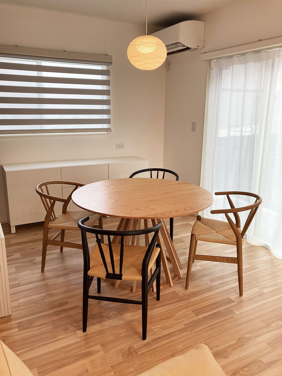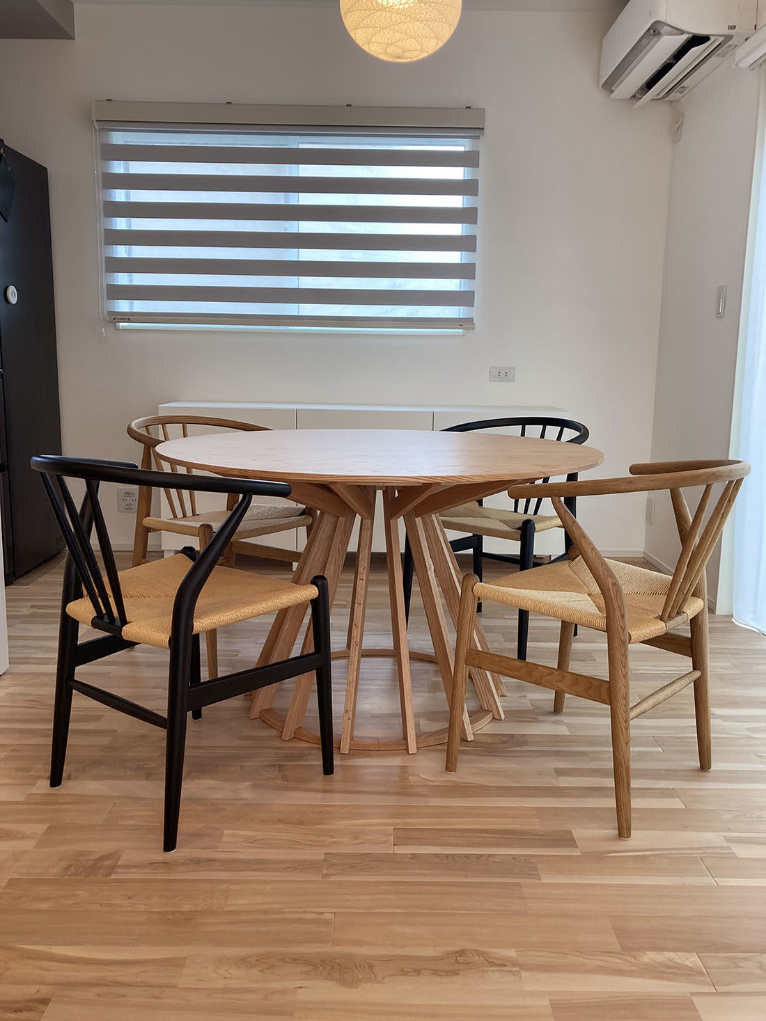 椅子はイロハチェアのペーパーコード、黒塗りの差し色を入れて、今っぽい合わせ方ですね〜